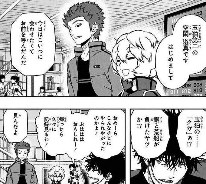 空閑は鈴鳴第一の村上に影浦隊の影浦を紹介してもらいますが、影浦は待ち合わせの場所でいざこざを起こしています。さらに、村上から影浦は人の心を読むサイドエフェクトを持っている事を聞かされます。影浦は特にA級や遠征部隊は目指しておらず、非常に好戦的で空閑に対しても挑発するような態度とりますが、空閑は気にしていないようです。
