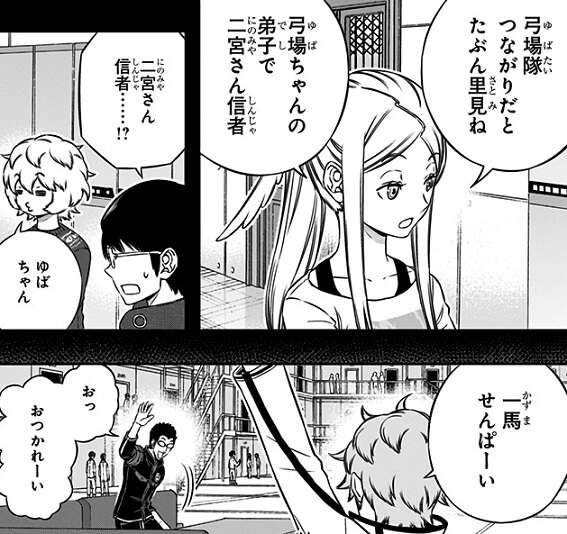 弓場隊の隊長がアタッカー寄りのガンナーと聞いて、空閑は試合前に手合わせをしたいと思っていたところ、緑川から弓場隊に詳しい人を紹介してしようか?と連絡が入ります。早速、空閑と三雲は緑川に会って紹介してくれるように頼むと、緑川は弓場隊長の弟子で自称 二宮信者、里美 一馬を紹介してくれます。