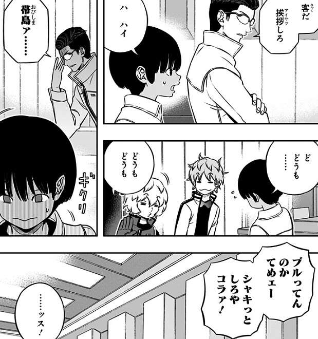 三雲は里美から色々話を聞くため里美の所に残りますが、空閑は事前に手合わせをしておきたかった弓場隊長 本人に会いに行きます。そこで弓場隊長から弓場隊の隊員 帯島を紹介され、空閑と帯島はぬるい挨拶を交わします。すると、弓場隊から帯島にシャキッとしろやと怒られ、帯島は大声で自己紹介をやり直させられます