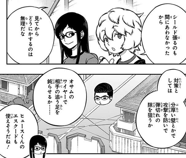 玉狛第2は集めた情報を元に改めて最終戦に向けたミーティングを始めます。まずは弓場隊ですが、弓場隊長の早撃ちは空閑から見てもかなりの速さで、空閑でも構えが早すぎて目で追えなかったようです。1対1(タイマン)勝負の近距離戦では見てからどうにかするのは無理で、対策としては三雲のワイヤーで足を鈍らせる、ヒュースのエスクードで攻撃を防いで弾切れを狙うなどがあがります。