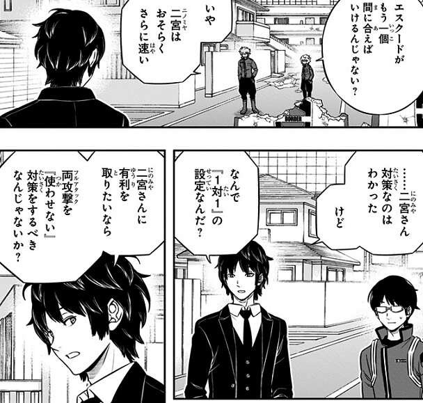 三雲は雨取とヒュースが合流できなかった別オプションの作戦の練習として、烏丸を頼ります。訓練室で烏丸のトリオン量を二宮と同じに設定してもらい、烏丸を仮想二宮として訓練したいと三雲は言います。1対1で二宮に両攻撃(フルアタック)をあえて使わせて隙を作り、その隙をついて二宮を落とす作戦です。