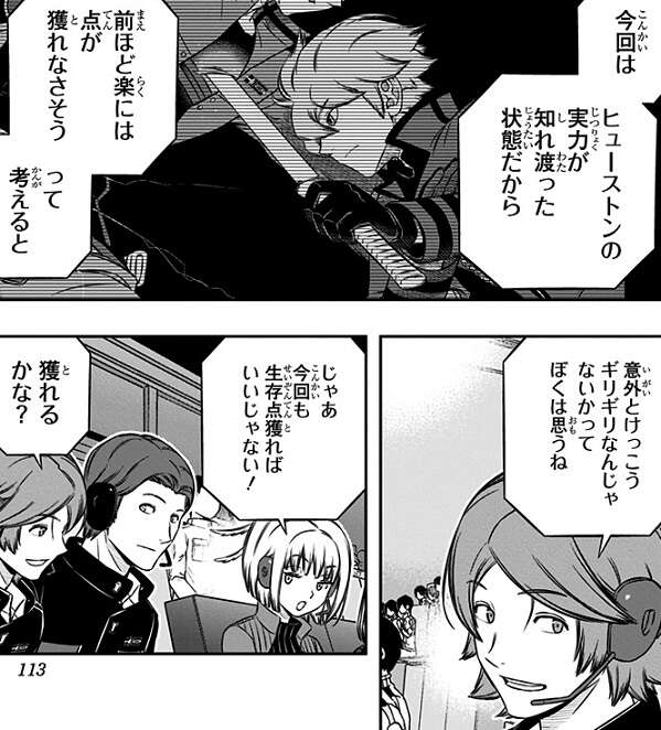 二宮隊との焼肉後の作戦室での対策会議で、ヒュースは雨取が人を撃てると思っている言い出します。雨取が人を撃てれば、三雲、空閑、ヒュースが雨取を守り、雨取はひたすらメテオラとハウンドを撃ち続ける、そんな力押しの戦法で5、6点は獲れると言います。この戦術が使えるかハッキリさせる為にも、ヒュースは雨取に改めて問い質します。
