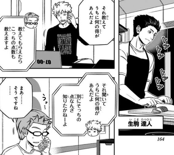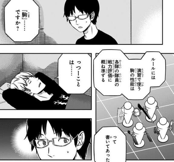 三雲が就寝しようとすると、諏訪が話しかけてきて明日から始まる『戦闘シミュ演習』のルールをチェックしたか?と、三雲に確認します。ルールは確認したと三雲は答えますが、問題は演習で使う駒だと諏訪は言い、演習で使う駒の性能は各隊の隊員の戦力評価に概ね準ずる、と三雲に言います。そこまで聞いて三雲は諏訪の言いたいことが分かったようで、戦力的に僕が部隊の負担になるってことですね……、と三雲は諏訪に言います。
