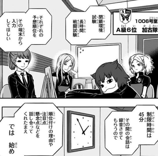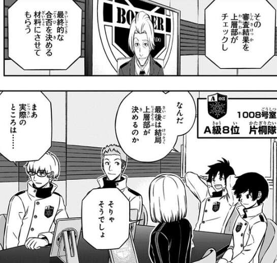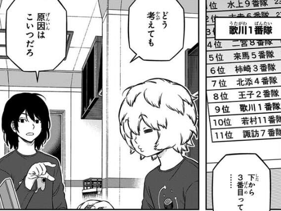 初日が終わり、臨時部隊の隊長のもとに閉鎖環境試験の初日時点での暫定順位が届きます。諏訪7番隊の暫定順位は最下位で、それを聞いた香取は怒りの表情を浮かべ爆発しそうになりますが、なんとか感情を爆発させるのは堪えます。三雲がやらかしたが、逆に言えば三雲がちゃんと働けば、真ん中くらいはいけるってことでしょ、と香取は言い、諏訪も同意します。歌川1番隊では、空閑が漆間から低い順位の責任を責められていました。