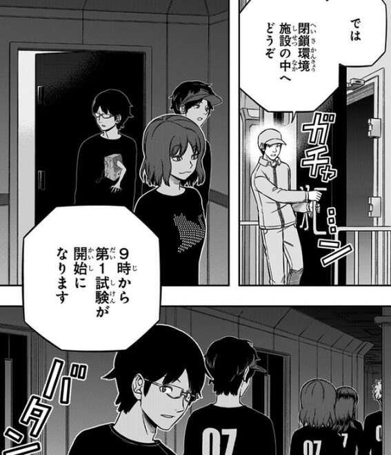 第1試験、1週間の閉鎖環境試験当日となり、玉狛第2のメンバーは閉鎖会場試験会場まで来ていました。三雲は全員で遠征に行こうと言い、空閑、雨取、ヒュースがそれに答えてそれぞれの臨時部隊へと別れていきます。三雲が諏訪7番隊の集合場所に行くと、既に三雲以外の全員が集まっていました。それぞれ衣類を着替えると、閉鎖環境施設の中に入っていきます。