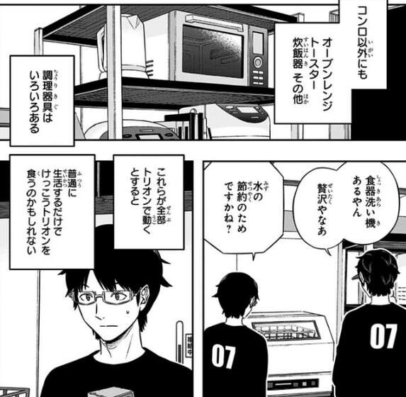 臨時部隊の隊長からの挨拶も終わり、各チームは隊長からの指示に従いそれぞれ動き出します。諏訪7番隊は、まずは施設内の設備の確認から始めます。寝室や仕事部屋、キッチンや食糧庫の食糧を確認していきます。食料は7日分には足りそうにありませんが、トリオン体なら1日2食で充分らしいので、1日2食で献立を考えていきます。