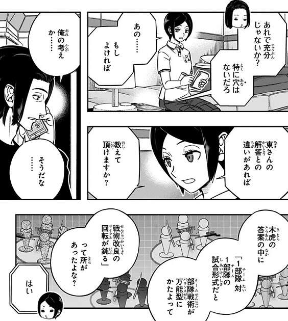 三雲が特別課題その②に集中している間に、諏訪7番隊は戦闘シミュで初勝利をあげます。若村7番隊に勝利しますが、同じ香取隊の若村のチームが弱かったので、香取は内心複雑な思いを抱きます。一方、特別課題その②の裏の意図でもある『役割分担をどう処理したか』を、上層部と迅が確認していきます。
