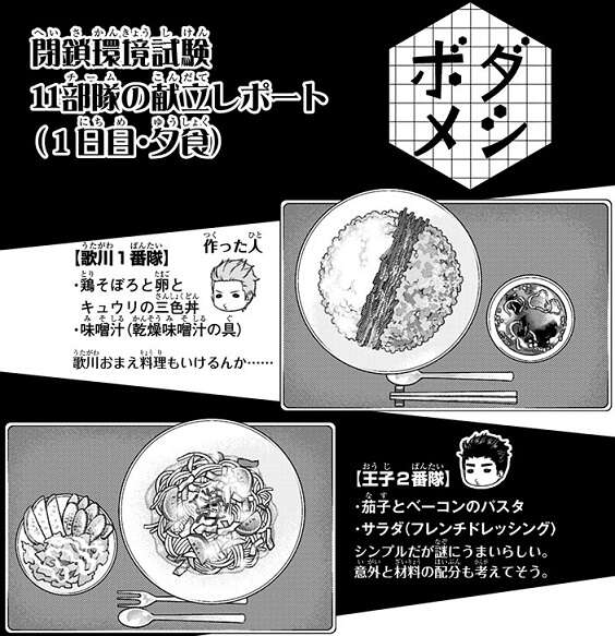 閉鎖環境試験 1日目・夕食の献立レポートです。ご飯を作れる人がいないと思われた歌川1番隊ですが、歌川は料理もいけたようでおいしそうな三色丼を作っています。モテる趣味として料理をしていたっぽい生駒は、茄子とベーコンのパスタを作って好評でした。