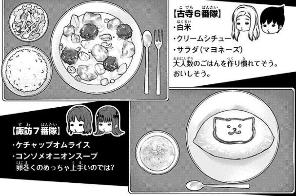 宇井と香取が担当した諏訪7番隊の夕食は、ケチャップオムライスとコンソメオニオンスープです。ケチャップオムライスにかわいい絵が描かれていますが、宇井と香取のどっちが描いたんでしょうか?