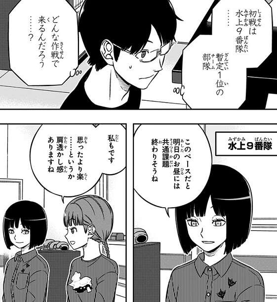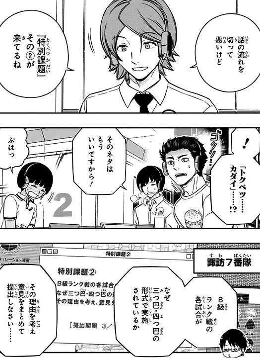 王子2番隊も戦闘シミュに苦戦していて、特に生駒は戦闘シミュの事を全く理解できておらず、一人で混乱していました。そこに特別課題その②が来て、生駒がまた混乱した表情をうかべます。諏訪7番隊は特別課題その②を三雲1人に任せることにし、他のメンバーは戦闘シミュに集中することにします。