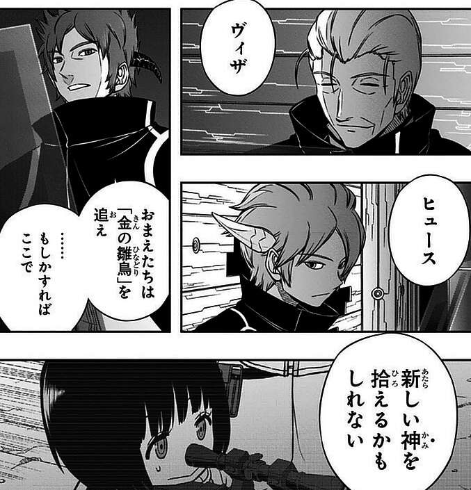雨取千佳がアイビスで撃った一撃で新型のラービットが倒されたのを見て、アフトクラトルの司令官、ハイレインは「金の雛鳥」か、と言い作戦変更して、ランバネインとエネドラを予定通り「門」に投入し、ヴィザとヒュースに「金の雛鳥」を追うように言い、雨取千佳を捕獲しようとします。