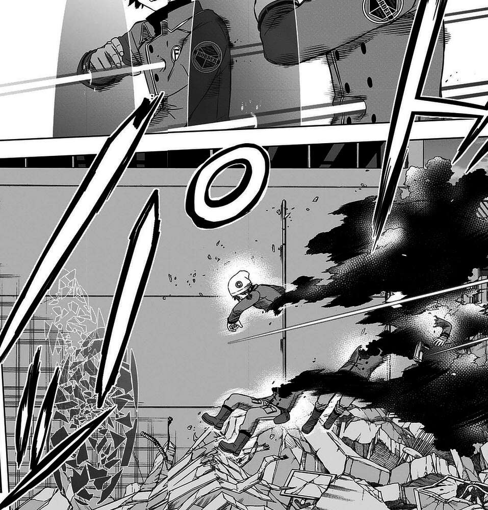 ランバネインの高い火力攻撃に出水、米屋、緑川は分断され、一人ずつ撃破されそうになり、まず緑川が狙われます。しかし、緑川は空閑との個人ランク戦の反省を活かして、ランバネインの片足を削って、ランバネインを追い詰めます。ランバネインも冷静に敵を分析し、今度は飛行しながら反撃を行い始めます。